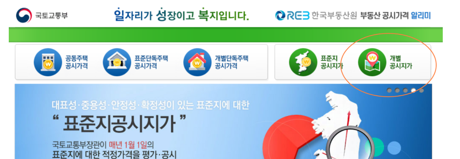 1. 사이트에 접속하면 상단메뉴 중 우측에 개별공시지가가 있습니다. 클릭해주세요.