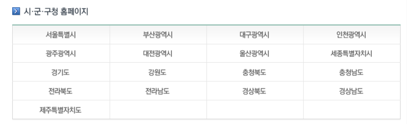 2. 그럼 다음과 같이 지역별 시군구청 홈페이지가 나타납니다. 원하는 지역을 클릭하면 해당하는 조회 페이지로 이동합니다.