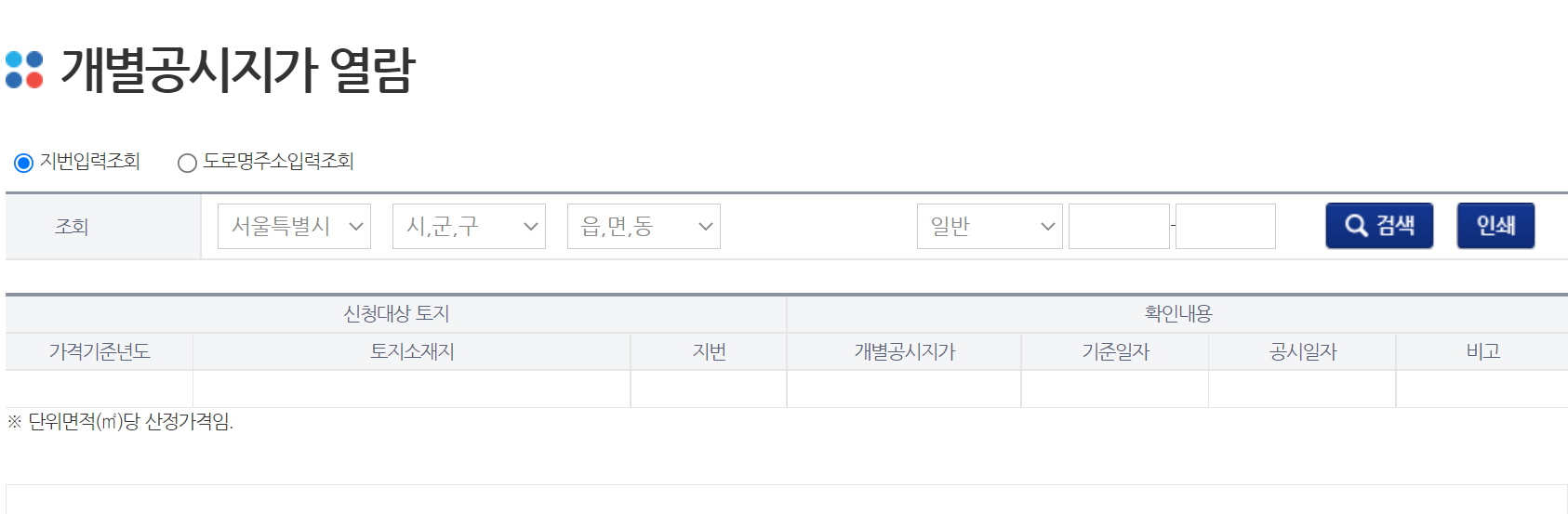 - 기준년월일로 결정된 자료를 토대로 하며 그 히우에 변동사항이 있는 경우는 실제 공시지가와 차이가 날 수 있습니다.