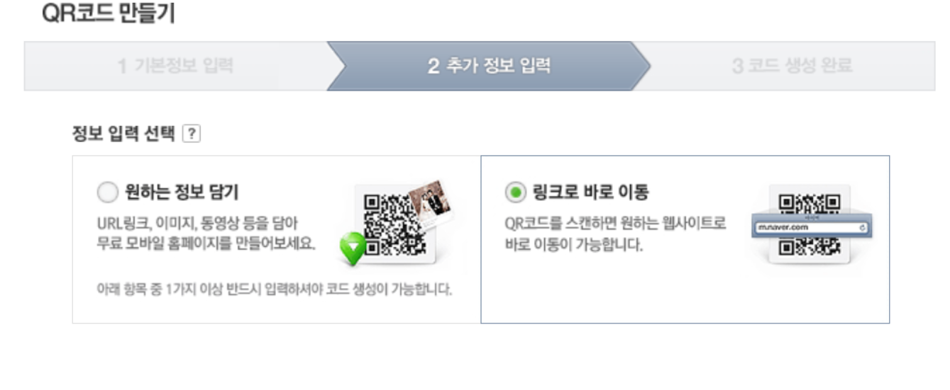 4. 그리고 '링크로 바로 이동'를 선택한 후 변환하고자 하는 URL주소를 입력합니다. 그리고 아래 작성완료를 누르면 큐알코드가 생성됩니다.