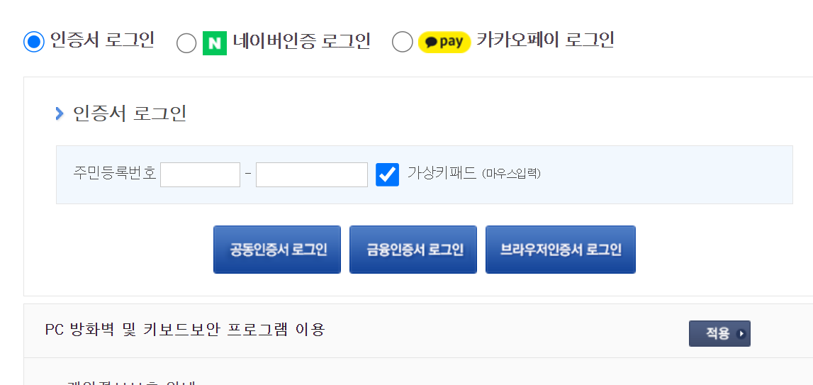 3. 네이버인증, 카카오페이, 공동인증서 등을 통해 로그인을 진행해주세요.
