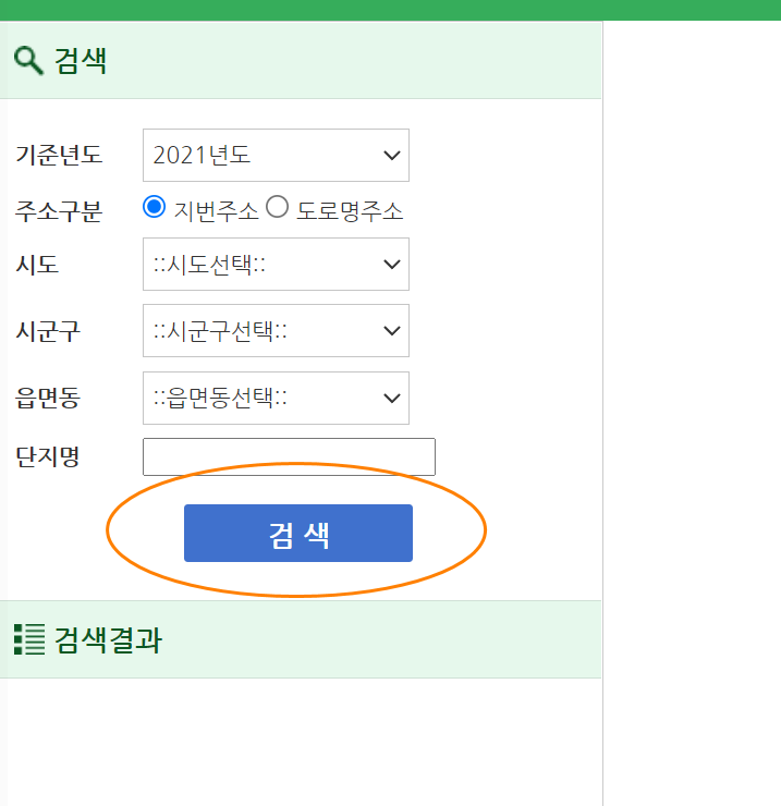 3. 왼쪽 주소 검색창에 원하는 아파트 주소지를 정확히 선택해주세요.