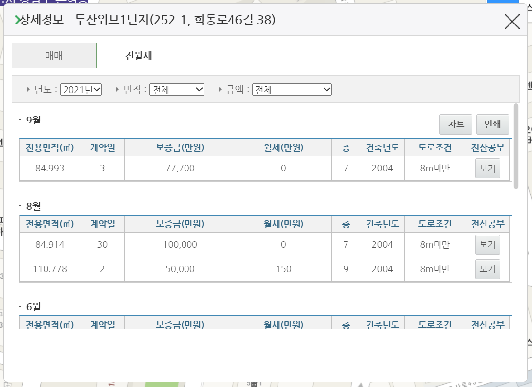 - 전월세: 보증금, 월세 등에 대한 자세한 정보를 확인할 수 있습니다.