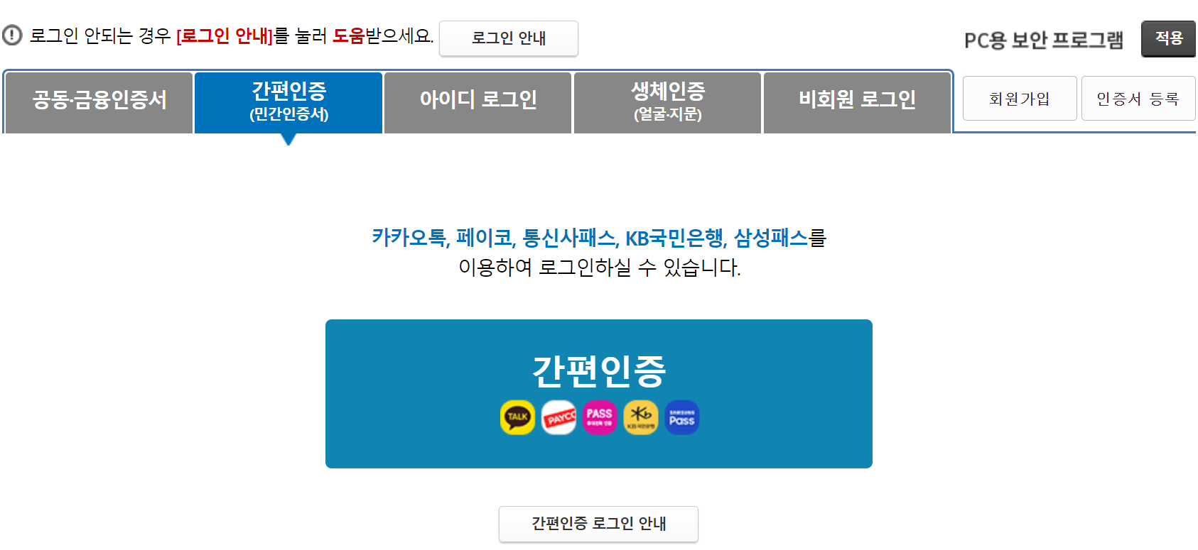 대부분의 서비스는 로그인이 필요합니다. 아래 링크를 클릭하면 해당 사이트로 이동합니다. 접속 후 상단 메뉴에서 로그인 혹은 회원가입을 눌러 진행해주세요. (공동인증서, 카카오톡, 페이코, 패스, 국민은행 등으로 본인인증 후 로그인하실 수 있습니다.)
