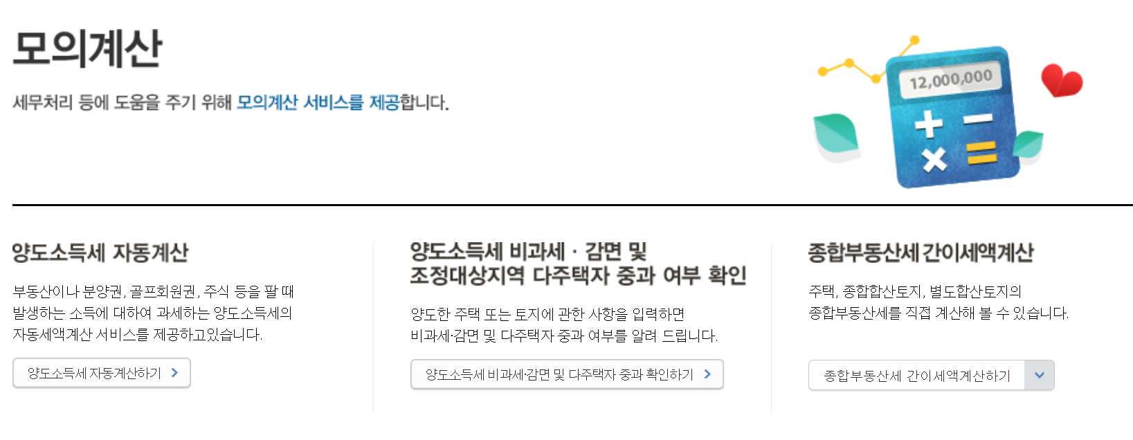 이외에도 세금모의계산, 상담 및 제보, 세무캘린터 등의 유용한 서비스가 있으니 꼭 활용해보시기 바랍니다. 홈택스 국세청 홈페이지 내에서 추가로 궁금한 내용이 있으시다면 국세상담센터 126으로 전화하여 주시기 바랍니다.