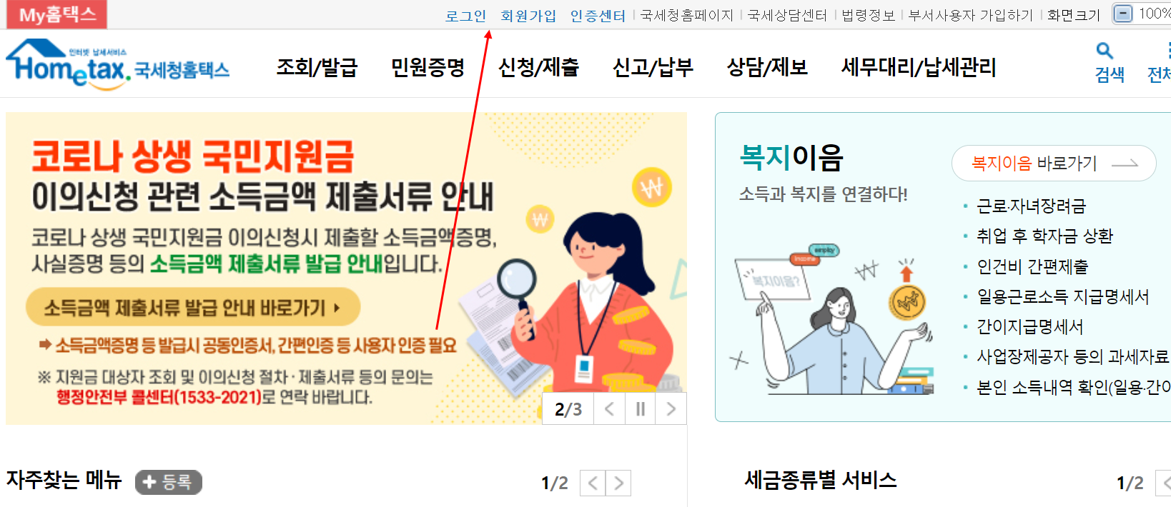 대부분의 서비스는 로그인이 필요합니다. 아래 링크를 클릭하면 해당 사이트로 이동합니다. 접속 후 상단 메뉴에서 로그인 혹은 회원가입을 눌러 진행해주세요. (공동인증서, 카카오톡, 페이코, 패스, 국민은행 등으로 본인인증 후 로그인하실 수 있습니다.)