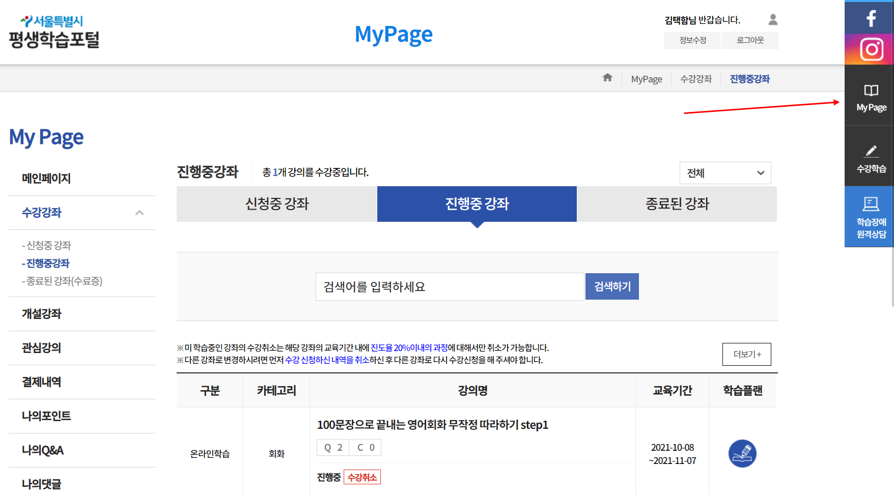 우측에 사이드바 메뉴 중 My Page로 들어가시면 현재 수강중인 강좌를 한눈에 볼 수 있습니다. 신청중이거나 진행중 혹은 수강이 완료된 종료 강좌까지 관리가 가능합니다. 이곳에서 진도율, 교육기간, 학습플랜, 수강취소 등을 할 수 있어 편리합니다. 그밖의 나의 댓글이나 질문 등도 정리되어 있으니 참고하시기 바랍니다.