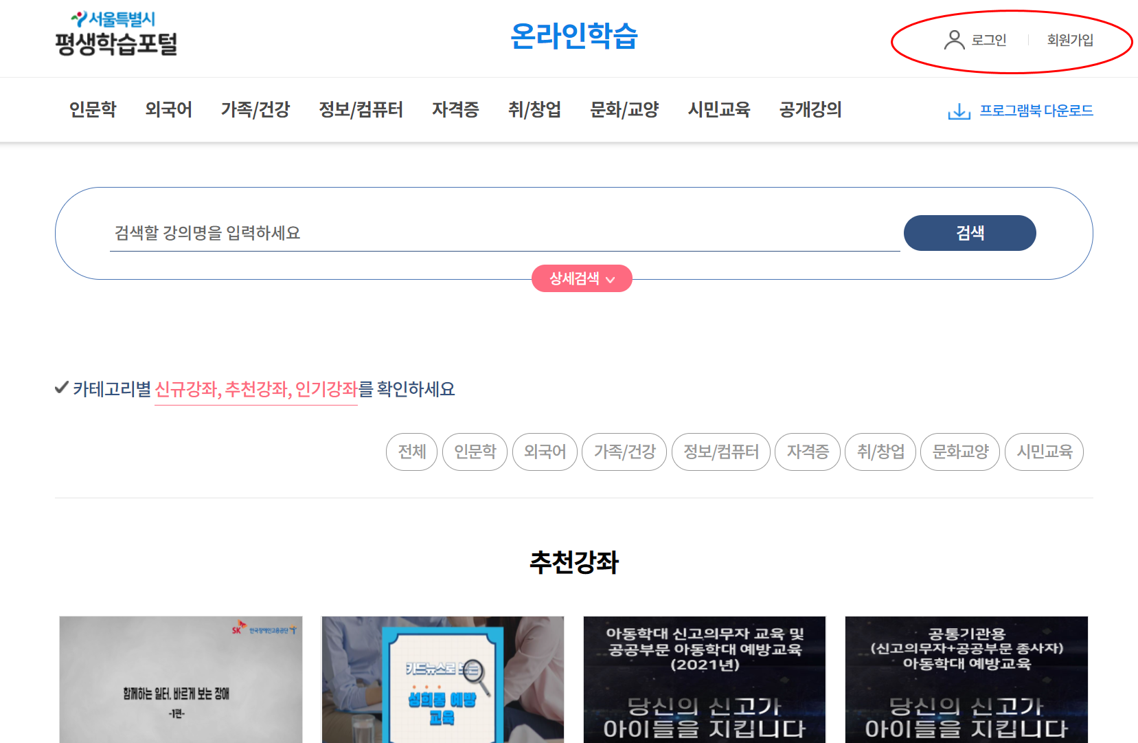 서울시에서 운영하는 포털 사이트로 누구나 손쉽게 온라인 상에서 다양한 교육을 받아볼 수 있는 플랫폼입니다. 인문학, 건강, 컴퓨터, 자격증 등 카테고리가 정말 다양하니 꼭 이용해보시길 추천드립니다. 로그인만 되면 바로 이용해볼 수 있으니 아래 내용을 확인해보시기 바랍니다.