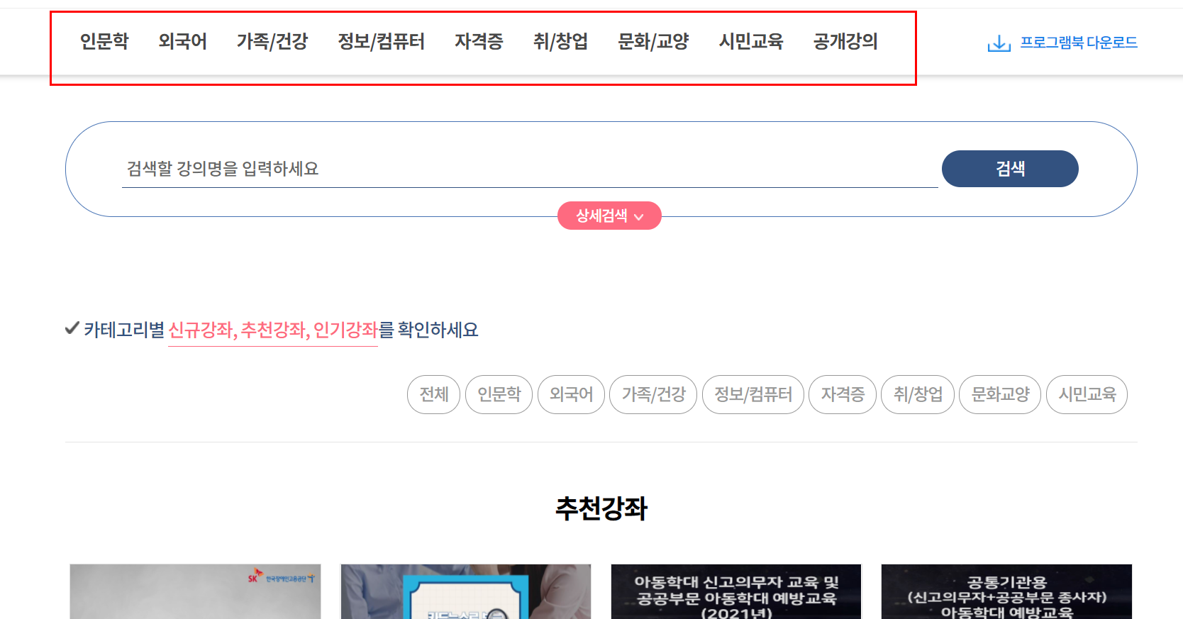 (혹은 검색창에 직접 강의명 키워드를 입력해 찾아볼 수 있습니다.)