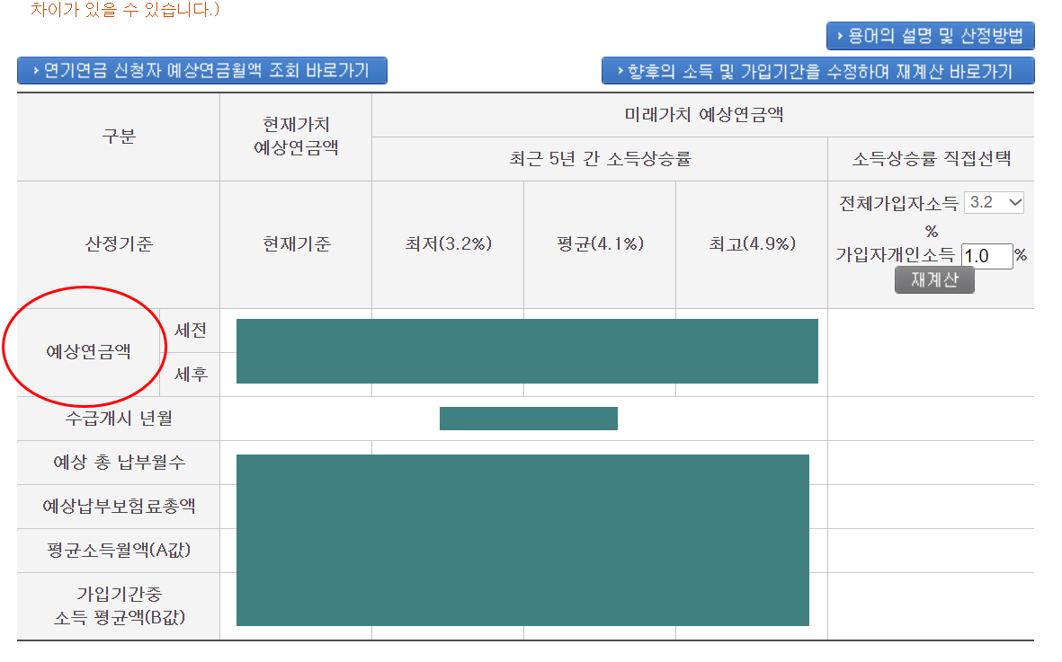 6. 그럼 다음과 같이 본인의 예상연금액을 나타내는 표가 화면에 표시됩니다.
