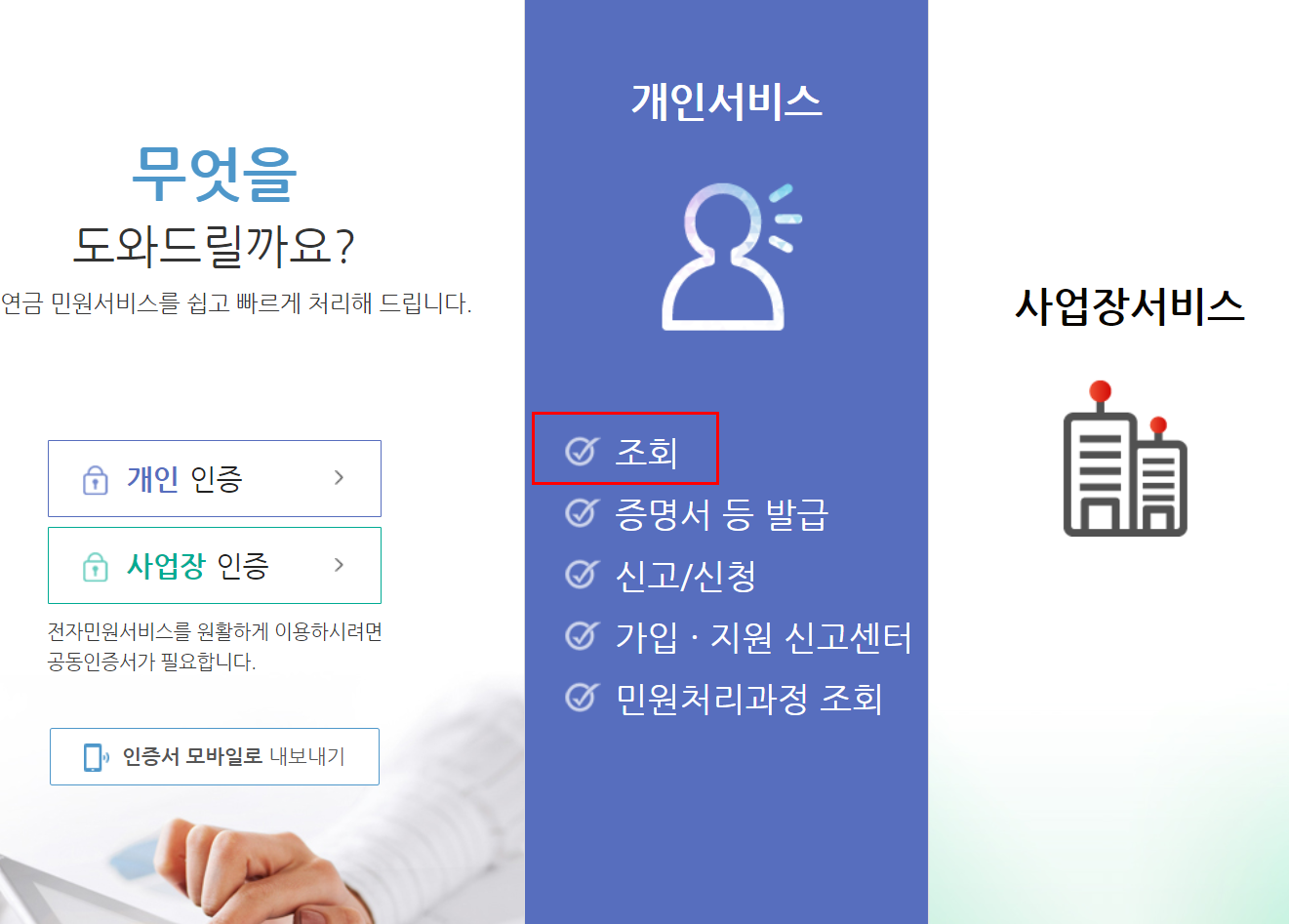 3. 개인서비스 메뉴에서 '조회'를 클릭합니다.