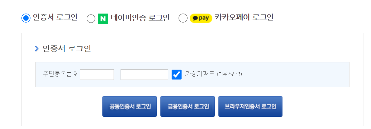 5. 그럼 로그인 화면이 나옵니다. 공동인증서, 네이버인증, 카카오페이 등을 통해 진행해주세요.