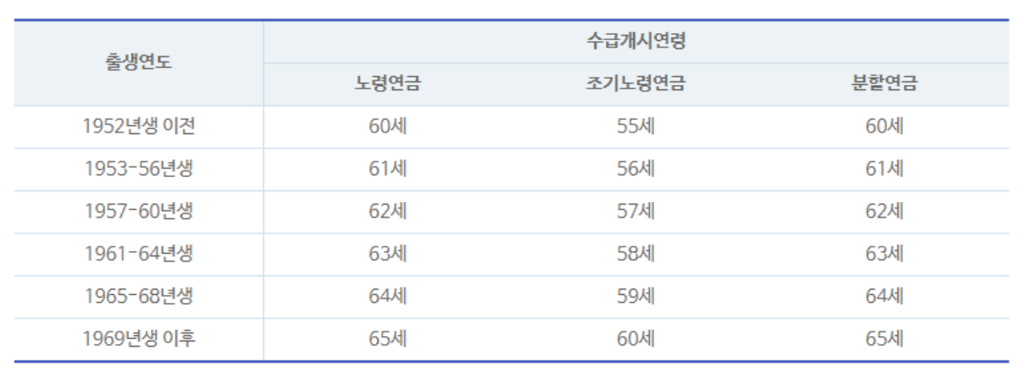 국민연금은 만19세 이상 60세 미만의 국내 거주자이고, 10년 이상 납부를 하면 수령할 수 있습니다. 국민연금은 60세부터 가능하며, 출생연도에 따라 조금씩 차이가 있습니다. 아래 표를 참고하시기 바랍니다.