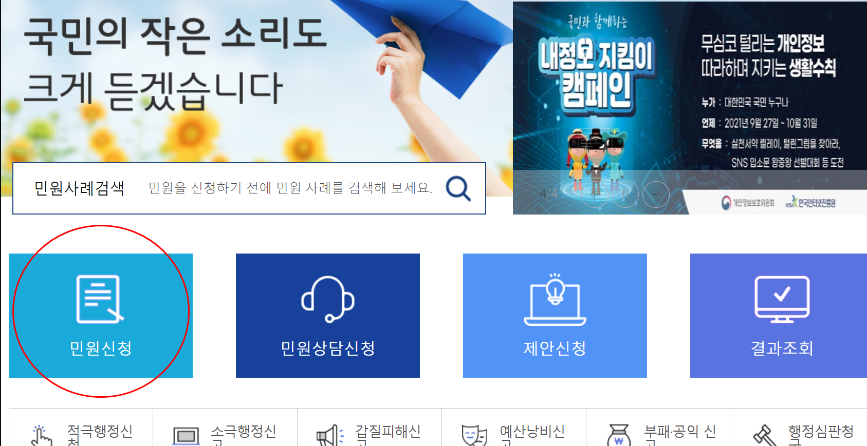 민원 업무가 필요할 때 직접 지자체 행정기관을 방문하기도 하지만 국민신문고를 통해 인터넷으로도 편리하게 신청이 가능합니다. 국민참여 포털서비스로 본인확인 후 누구나 쉽게 이용할 수 있는데요. 아래 국민신문고 홈페이지 이용안내에 따라 민원신청 및 기타 서비스에 대해 확인해보시기 바랍니다.
