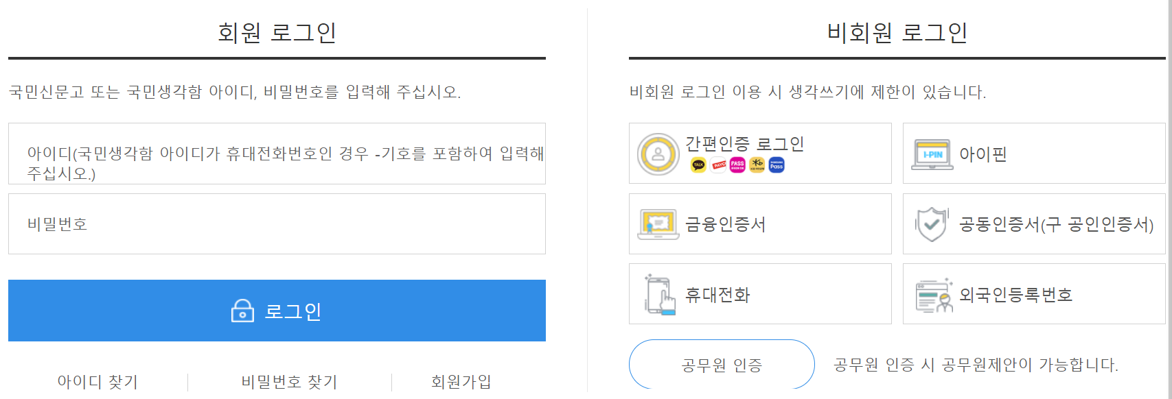 국민신문고 홈페이지에 접속하면 먼저 로그인을 해야 민원신청을 할 수 있습니다. 회원가입 혹은 인증을 통한 비회원 로그인이 있습니다.