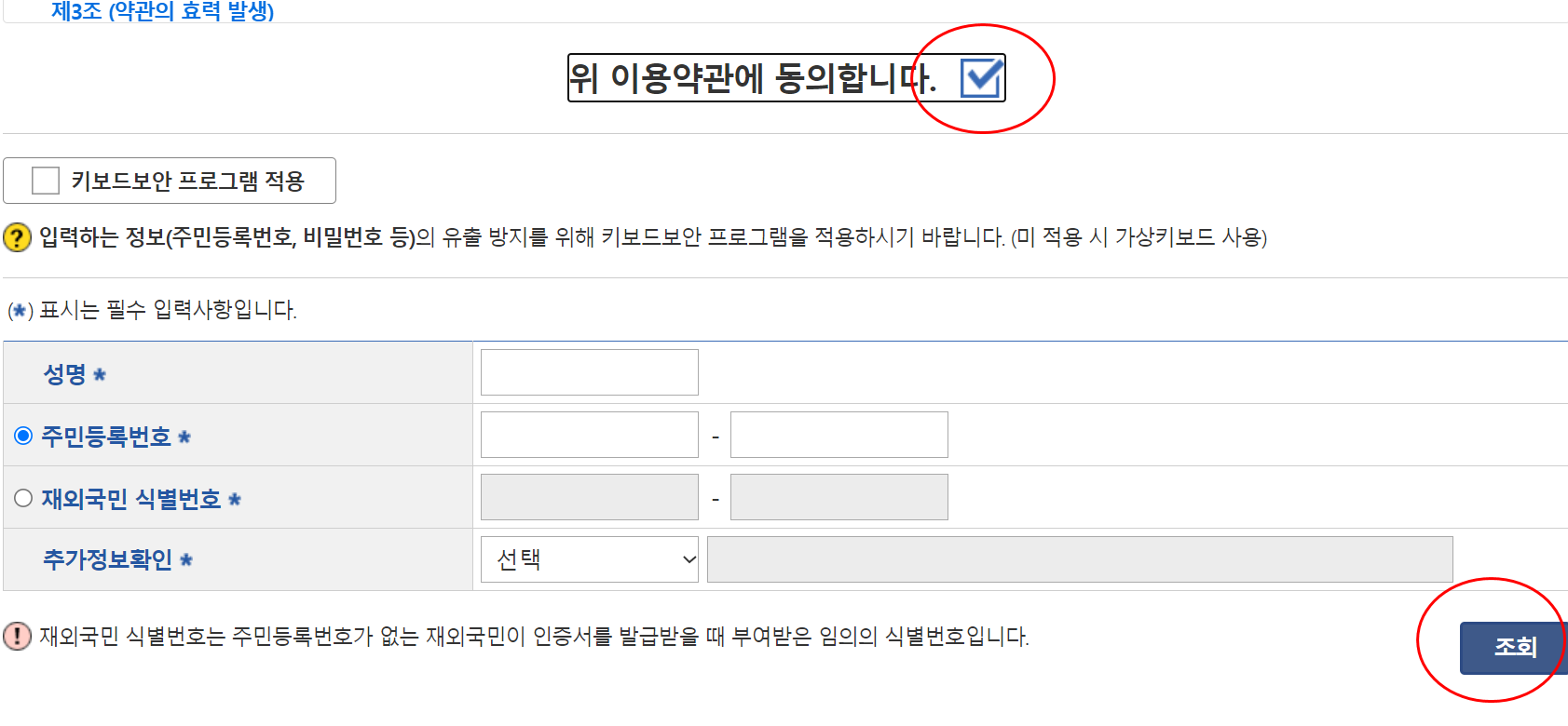 4. 그리고 아래 약관 동의 체크 및 본인정보 입력 후 조회를 클릭합니다.