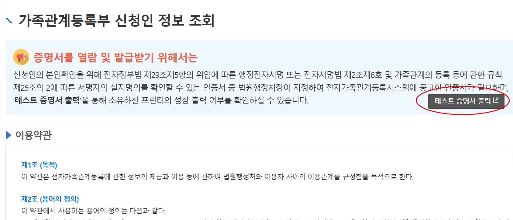3. 이용하는 컴퓨터에 프린터가 제대로 작동하는지 확인하기 위해 <테스트 증명서 출력>을 진행해주세요.