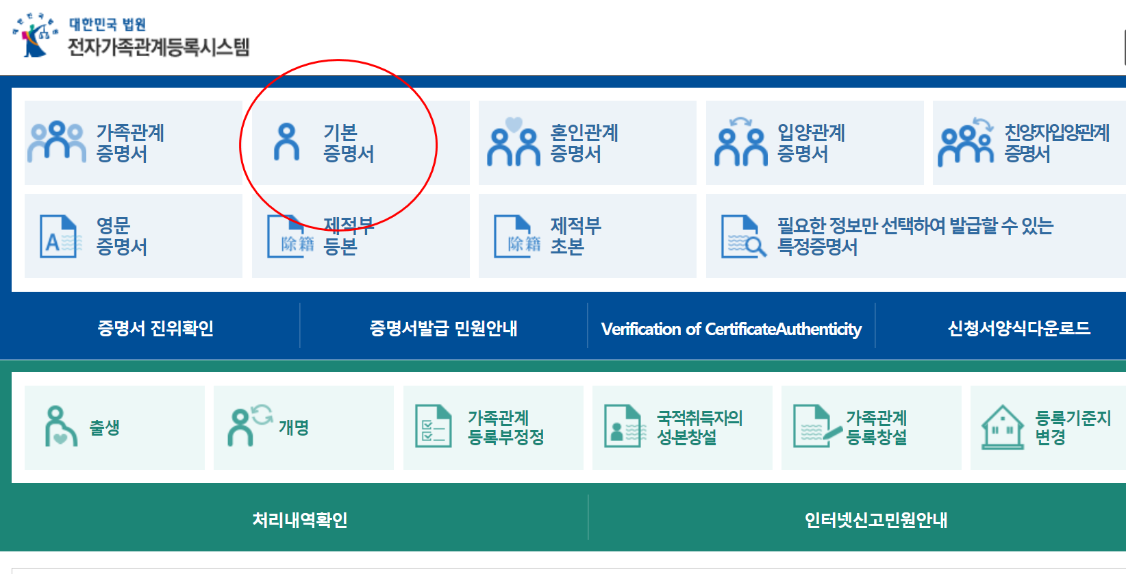 기본증명서에는 성명, 주민등록번호, 거주지 등이 기입되어 있으며 변동된 사항을 반영해 이를 증명할 수 있는 서류입니다. 주민센터에 직접 방문해 발급을 받을 수도 있지만 전자가족관계등록시스템에 접속하면 인터넷으로 이용가능합니다. 아래 순서에 따라 직접 기본증명서 인터넷발급을 진행해보세요.