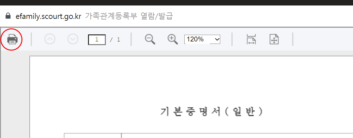 7. 새로운 창에 기본증명서가 나타납니다. 좌측에 프린터기 모양을 클릭하면 출력을 할 수 있습니다.