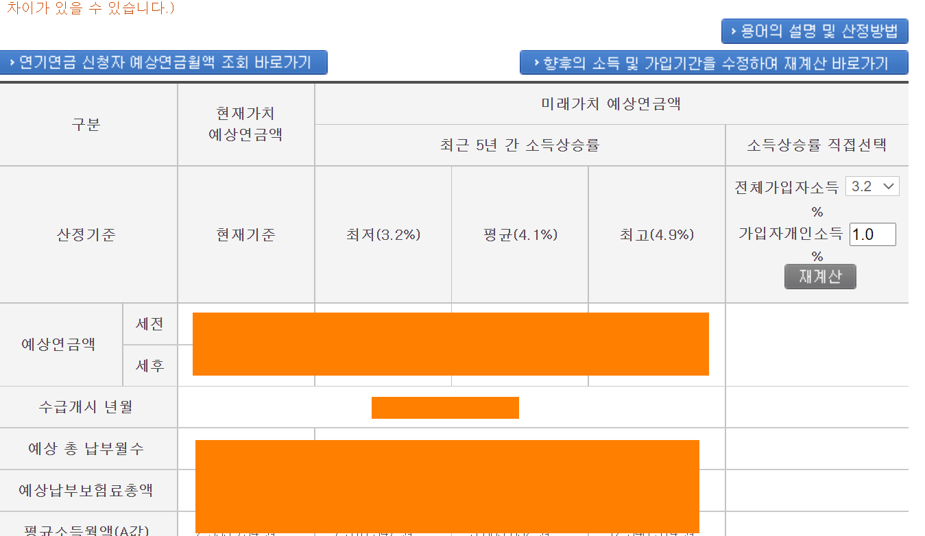 *예상연금액을 세전, 세후로 확인할 수 있어며, 소득상승률을 고려한 예상연금액도 확인할 수 있습니다.