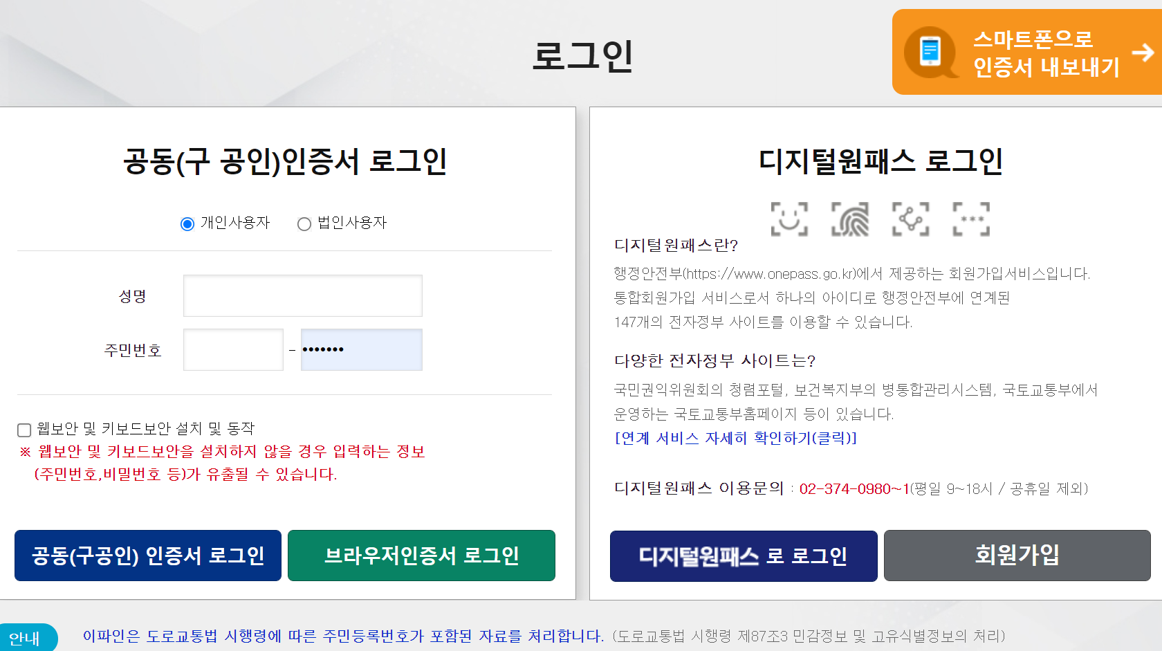 3. 공동인증서, 디지털원패스 등을 통해 로그인을 진행해주세요.
