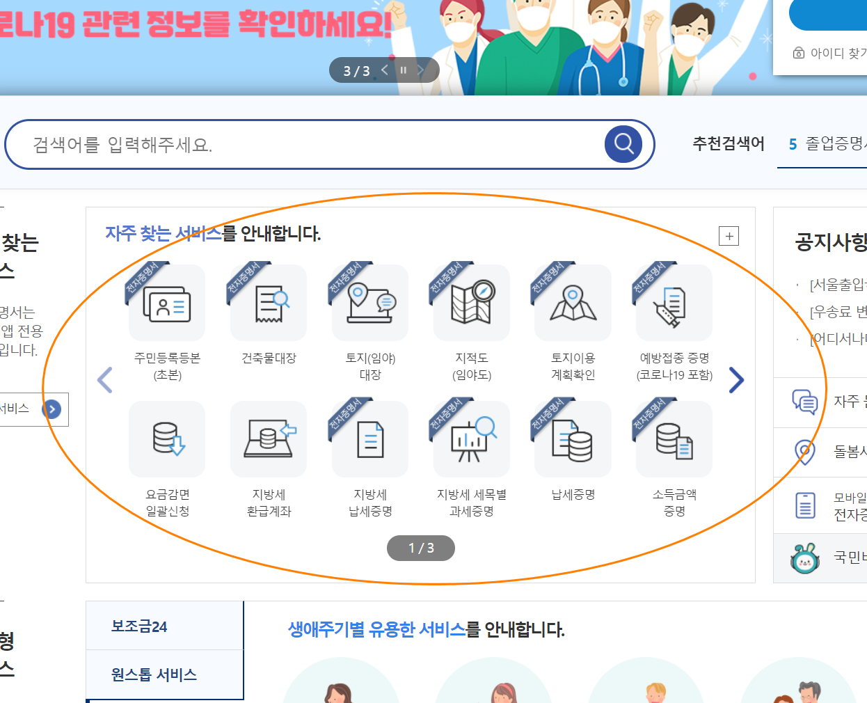 정부24를 이용하는 분들이라면 대부분 메인페이지에 있는 자주 찾는 서비스를 이용합니다. 이곳에 거의 모든 민원업무가 마련되어 있는데요.