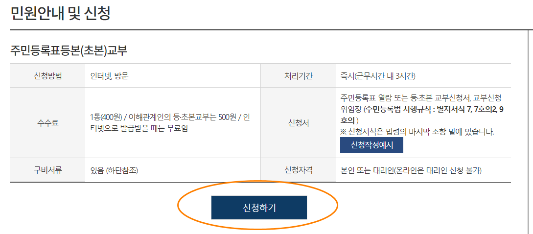방문 시에는 1통 당 400원의 수수료가 발생한다는 점을 참고해주세요. 이하관계인의 등,초본 교부의 경우에는 500원입니다.