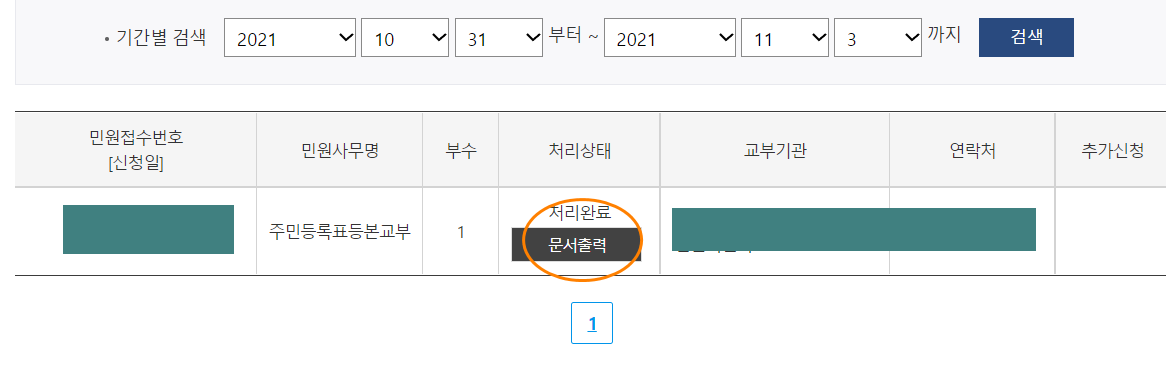 4. 아래 민원신청하기를 클릭한 후 다음 화면에서 '문서출력'을 클릭합니다.