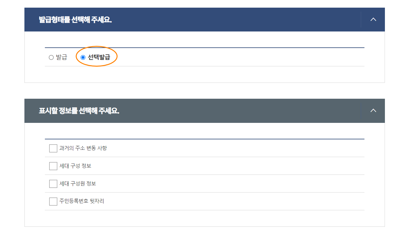 *선택발급은 주민등록등본 상 원하는 정보를 선택해 표시할 수 있게 해줍니다.