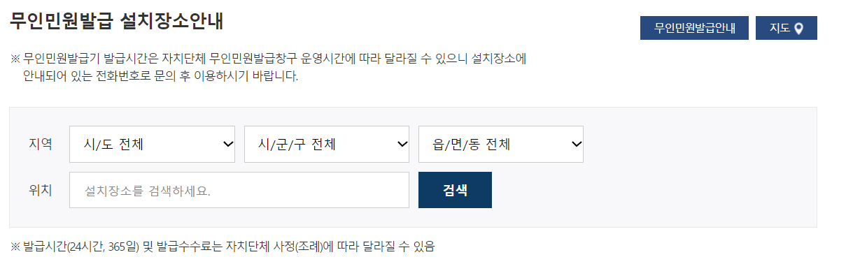 주민센터에 방문해도 되지만 가까운 무인민원발급기를 이용하는 것을 추천드립니다. 위치는 아래에서 검색해보실 수 있습니다.