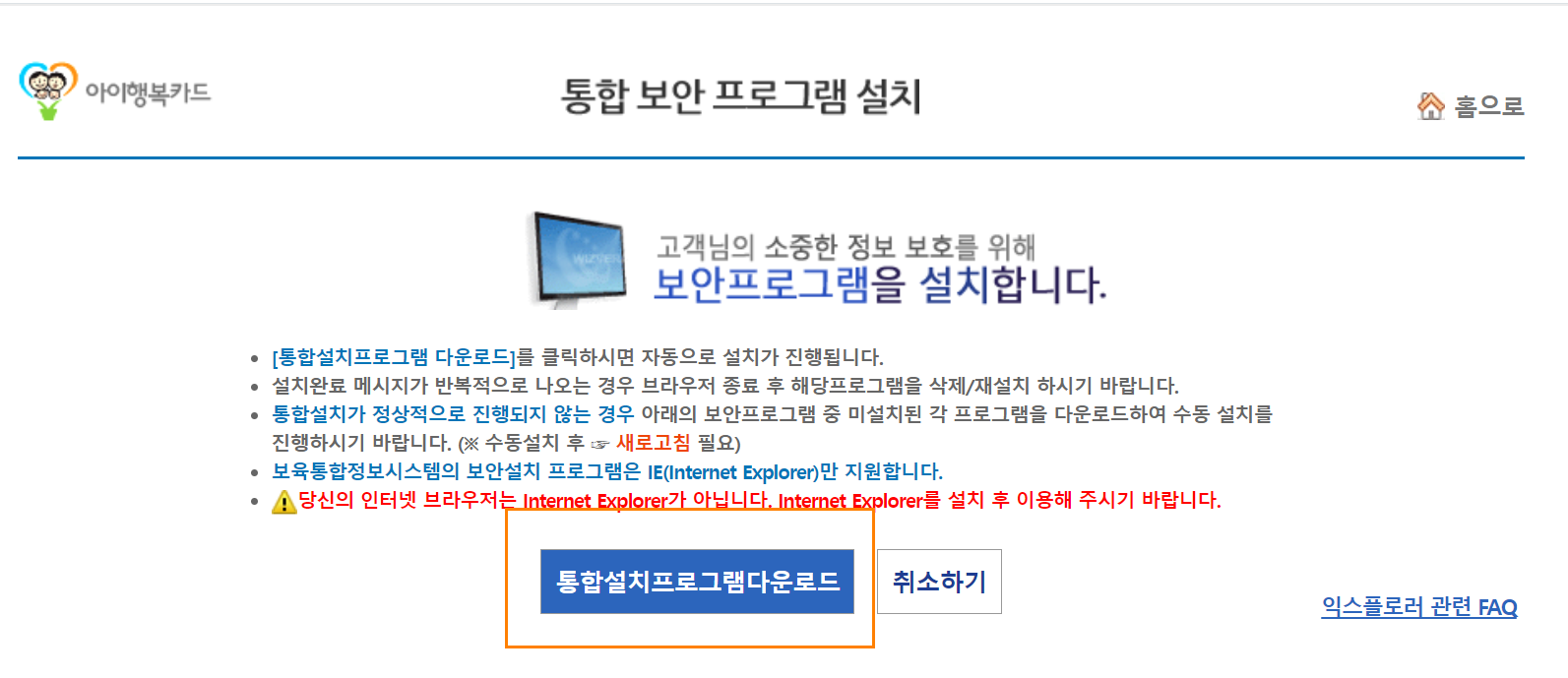 *놀랍게도 인터넷 익스플로러만 사이트 이용이 가능합니다. 크롬이나 웨일 등의 브라우저를 이용하신다면, 컴퓨터에 설치된 인터넷 익스플로러를 실행하시기 바랍니다.