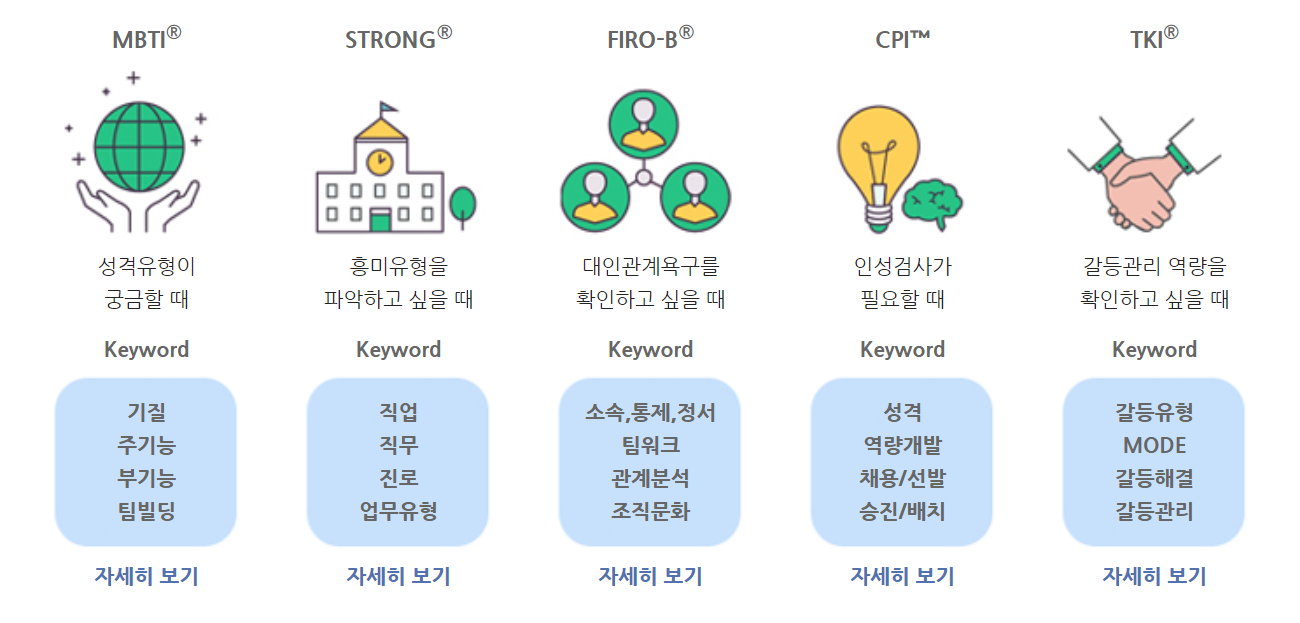 위에서 소개한 사이트는 무료 MBTI 검사소이며, 정식 테스트는 아닙니다. 그에 걸맞는 퀄리티를 갖추고 있지만 보다 전문적인 MBTI 성격유형검사를 추가로 받고자 한다면 아래 사이트를 참고하시기 바랍니다.