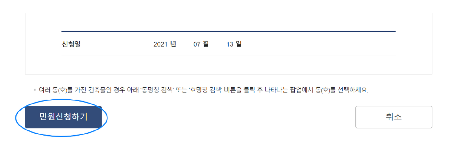 5. 모두 기입하셨으면 아래 민원신청하기를 누르면 정부24 건축물대장 열람 절차가 완료됩니다.