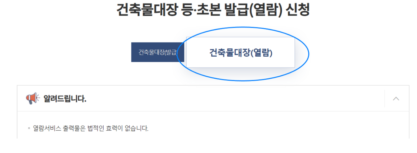 건축물대장을 단순 열람하는 것이 아닌 발급을 원하는 경우에는 신청페이지 상단에서 꼭 발급을 클릭해주세요. 열람한 화면을 출력하거나 캡쳐해도 법적인 효력이 없습니다.