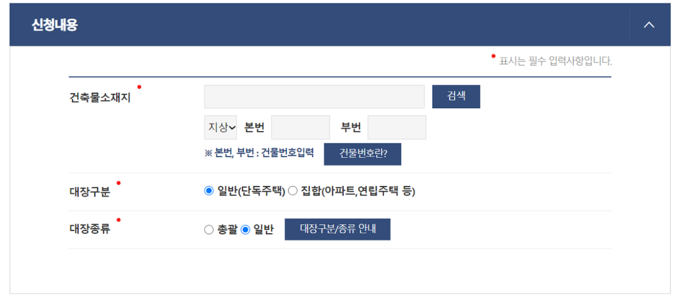 4. 신청화면에서 건축물대장(열람)을 선택한 후 아래 내용을 정확히 기입해주세요.