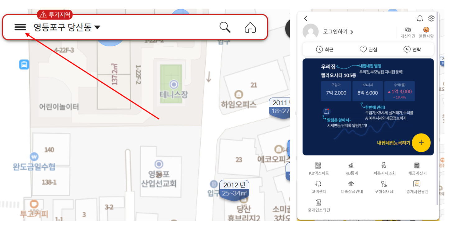 검색창 좌측의 더보기(세로 3줄)을 누르면 여러 서비스 메뉴가 나옵니다. KB통계, 세금계산기, 관련 금융상품, 고객센터 연결 등을 빠르게 이용할 수 있습니다.